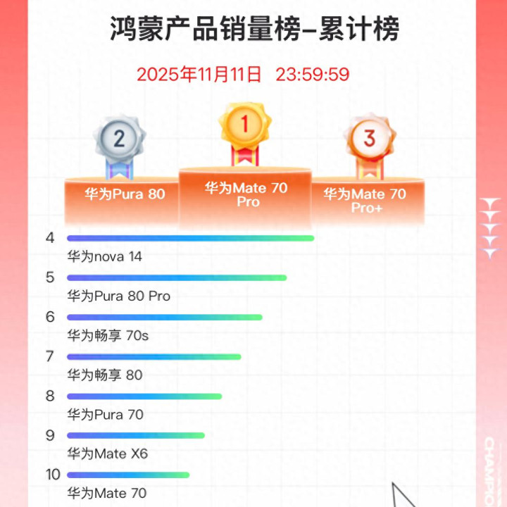 从2025年开始,京东手机竞速榜新增了鸿蒙产品专区,今年我们分享的就是京东双11华为手机排行榜。除了华为Nova14和两款畅享手机,其他七款机型均为旗舰手机,其中有4款来自于Mate系列,剩下3款属于Pura系列。定位中端的华为Nova14仅排第四,最近发布的华为Pura80排名第二,第一名大家猜对了吗?